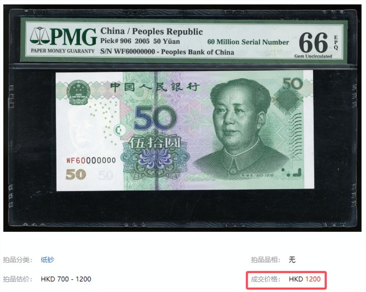 比如一张2005年的50元纸币,它的流水号是60000000这样的7同号,再网拍上卖出了1200港币。